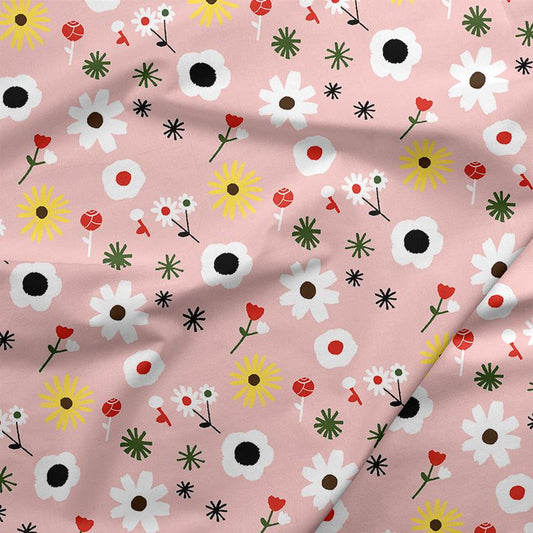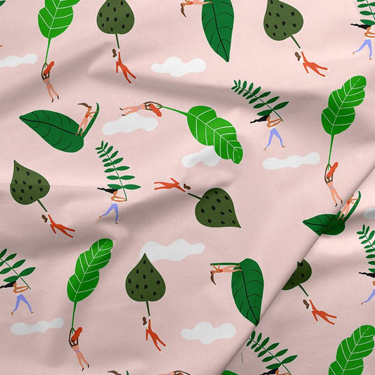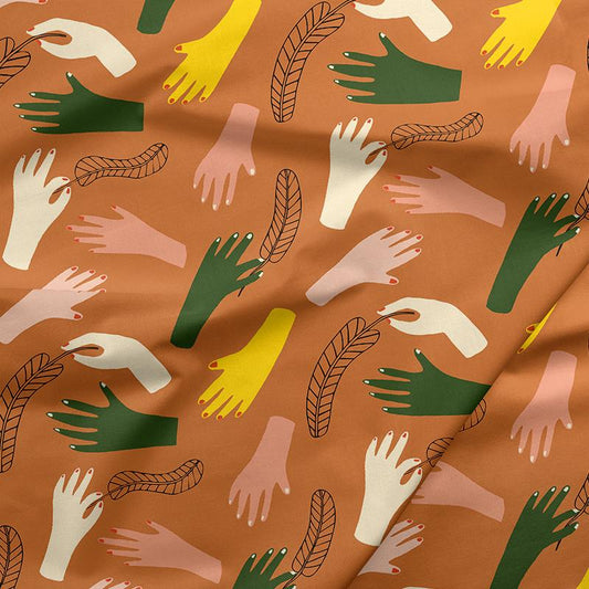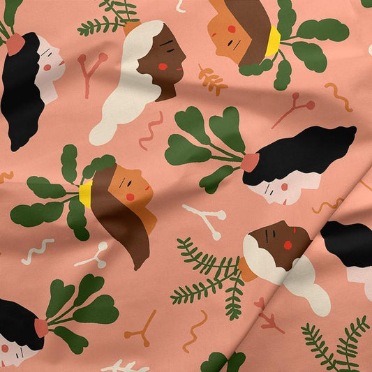 With this fabric collection, illustrator Carolyn Suzuki wanted to reflect on her love of plants, and to attempt to manifest the supernatural ability to grow and help houseplants thrive! These abstract, modern cotton prints are adorned with tropical plant leaves, playful florals, animated women’s profiles, and lots of helping hands. These unique novelty prints are perfectly suited for a trendy blouse, a summery wrap headband, or DIY planter decorations to brighten up your own greenhouse!