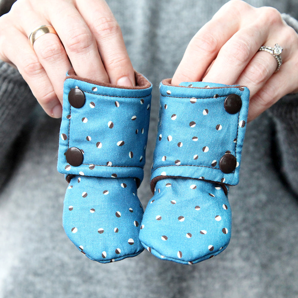 These booties, sewn by Cori of ATaleOfTwoThreads, are lined with fleece and available with leather or non-skid material for the sole if your baby is walking. Pattern by Kate at BeautifulPieShop.
