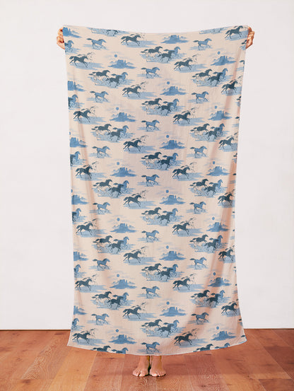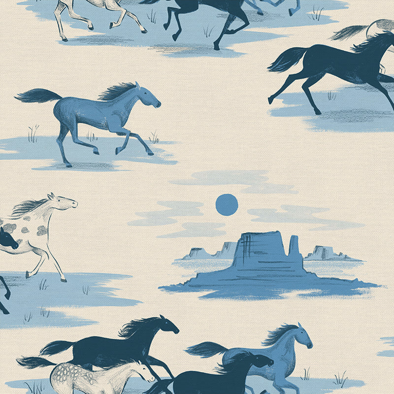 Desert Horses embraces the magic of the American West including a windswept canyon, cactus blooms, desert plants, and a traditional bandana-inspired design. The collection features three colorways- a classic navy, rustic peach, and mustard yellow.