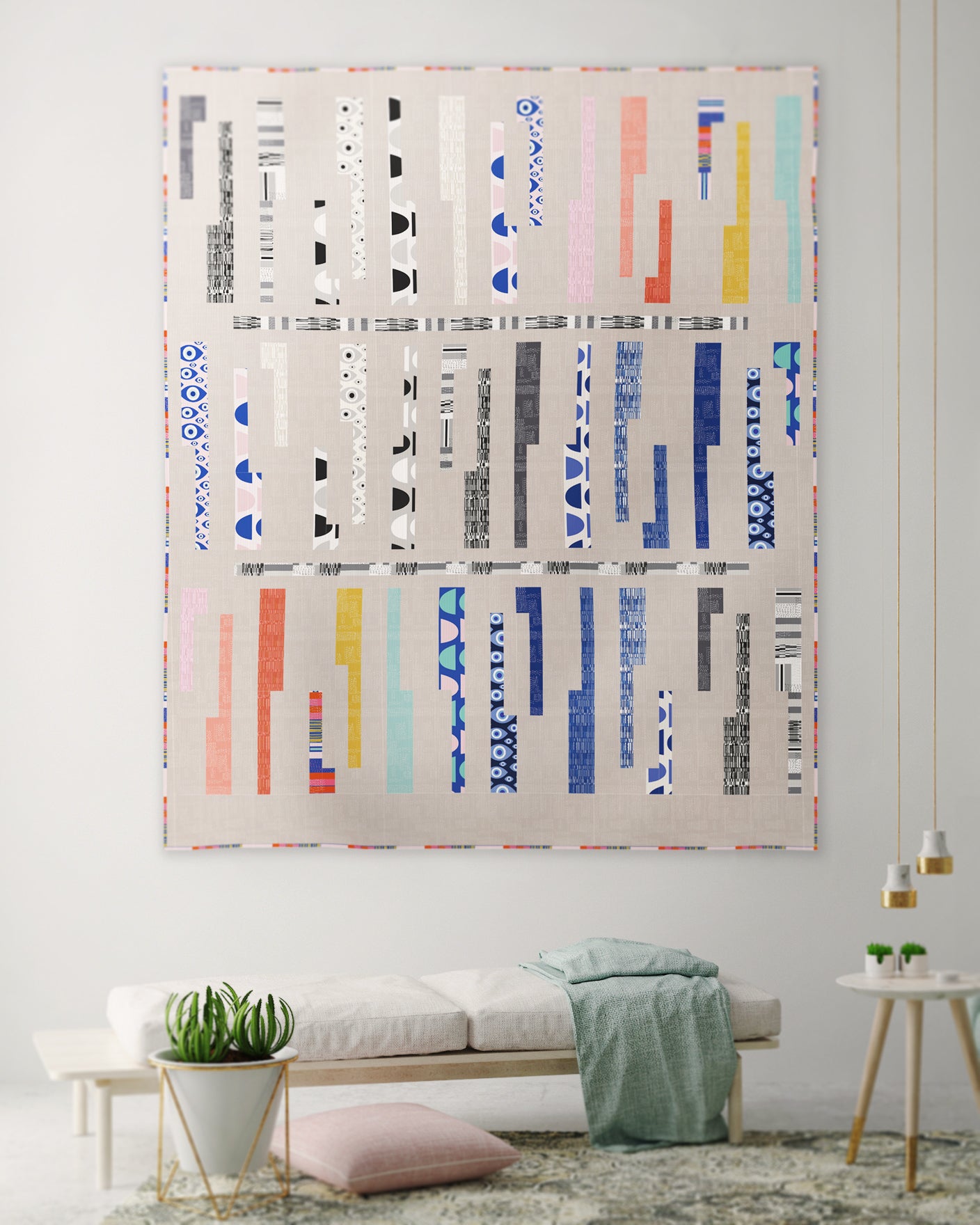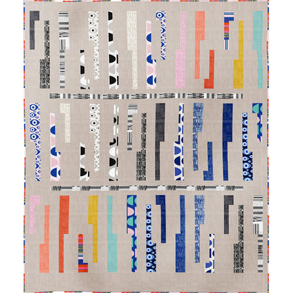 A modern abstract quilt featuring Roam by Emmie K for Paintbrush Studios. This pattern features easy to follow instruction, full color diagrams and coloring page.