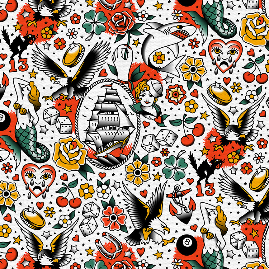 Timeless Tattoos is a bold and vibrant fabric collection that captures the spirit of classic Americana tattoo art. With iconic designs like anchors, roses, swallows, lucky dice and skulls, each print showcases the timeless style of traditional tattoos—bold lines, rich colors, and a rebellious edge. Perfect for quilting, apparel, and statement pieces, this collection brings the inked aesthetic to life with a touch of nostalgia and a whole lot of attitude.